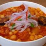 Agregar 500 ml de caldo de pata reservado, agregamos el frejol caballero cocido, removemos y agregamos los embutidos y las patas de cerdo, tapamos la olla y dejar cocer por 15 minutos, remover y emplatar.